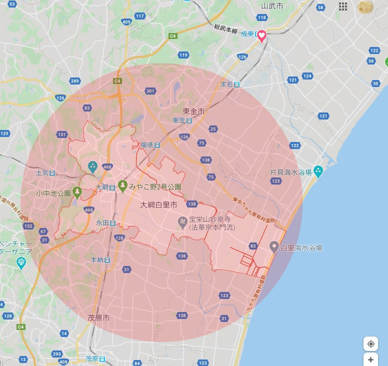 海から内陸に向けて横に長い大網白里市。