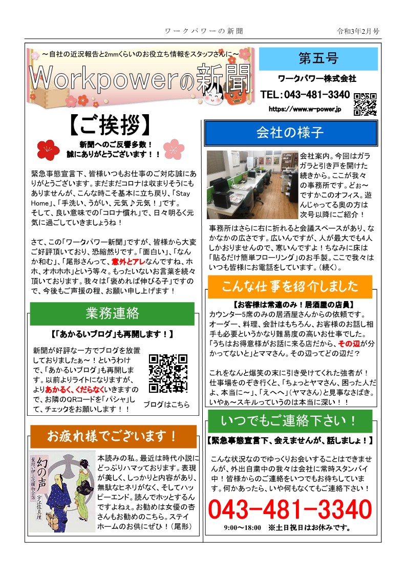2021年の記事2021.05.24 2022.08.08 ワークパワー株式会社 2021年2月:第五号 ツイート シェア はてブ LINE Pocket 2月といえば豆まき、恵方巻!そんなこととは一切関係ありませんが、好評のワークパワー新聞、2月号です! ツイート シェア はてブ LINE Pocket feedly コメントを残す コメントをキャンセルメールアドレスが公開されることはありません。 ※ が付いている欄は必須項目ですコメント ※ 名前 メール サイト 次回のコメントで使用するためブラウザーに自分の名前、メールアドレス、サイトを保存する。 Δemail confirm* post date* 日本語が含まれない投稿は無視されますのでご注意ください。(スパム対策)