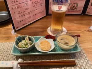 お通しはキスの酢漬け、えびしんじょ、あさりの茶碗蒸し。